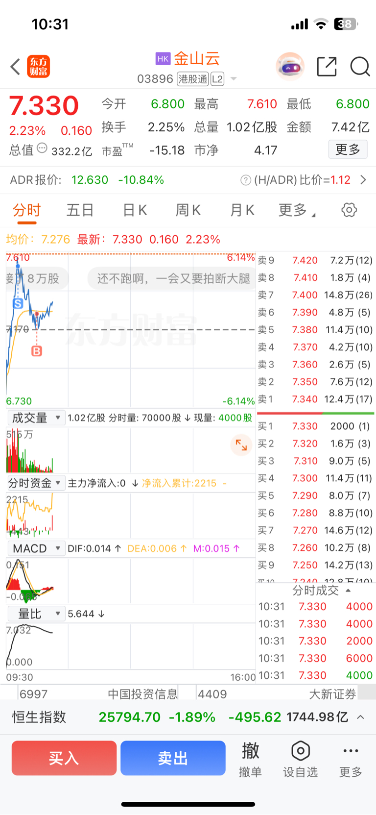 $金山云(HK|03896)$ 竞价 6.8 没挂单,还想着再跌点买入,太贪心了