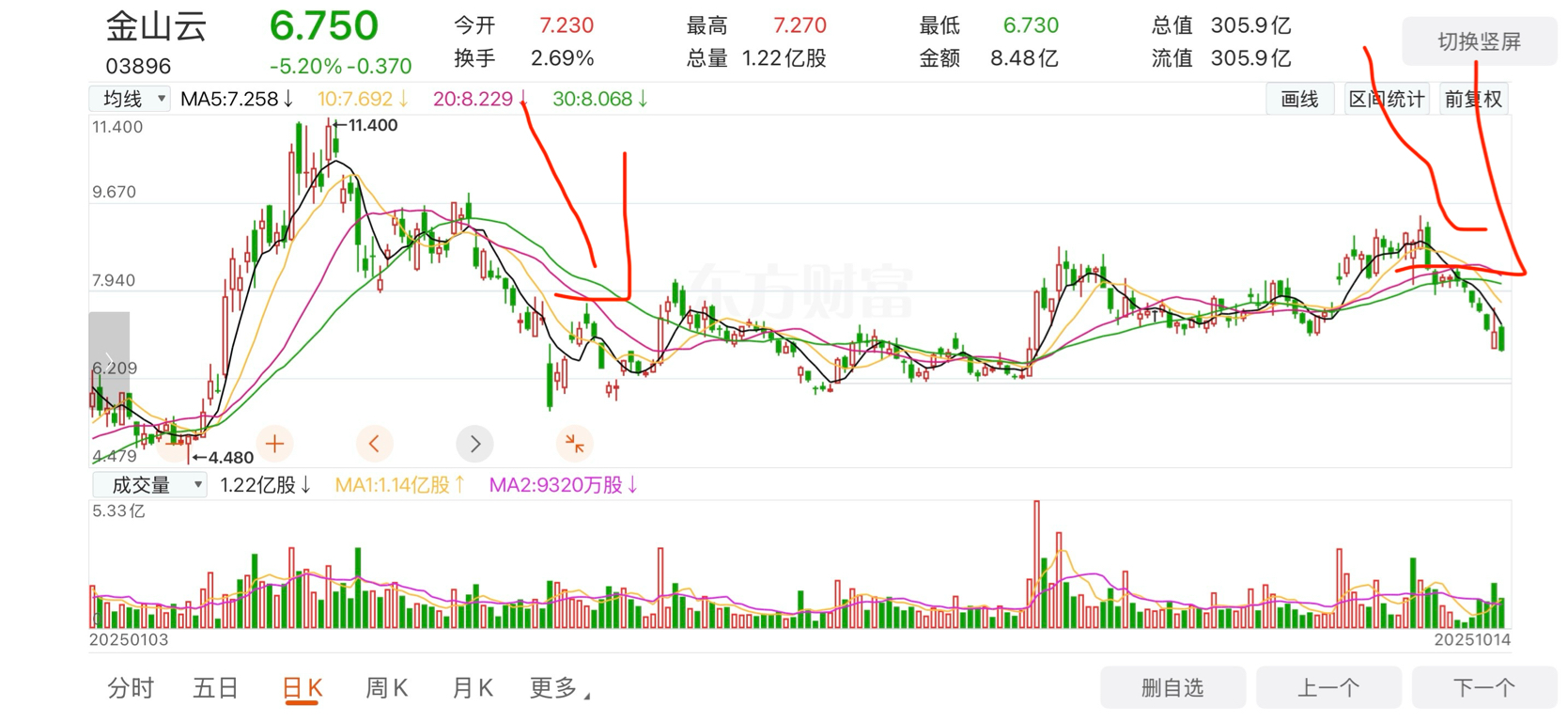 $金山云(HK|03896)$ 跟年初配股下跌一模一样,天天跌
