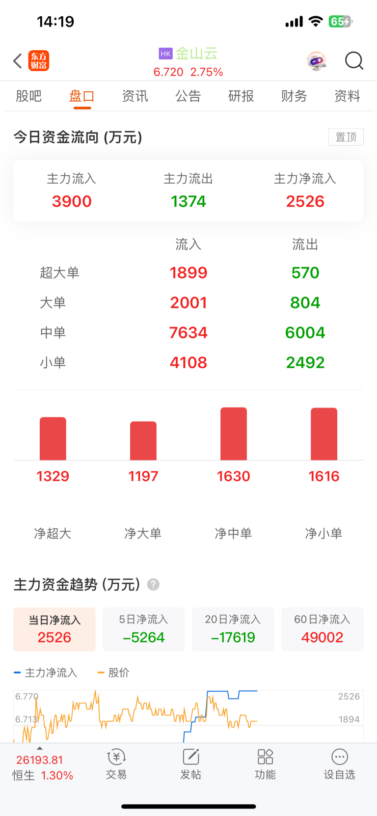 $金山云(HK|03896)$ 主力开始流入,有企稳迹象了