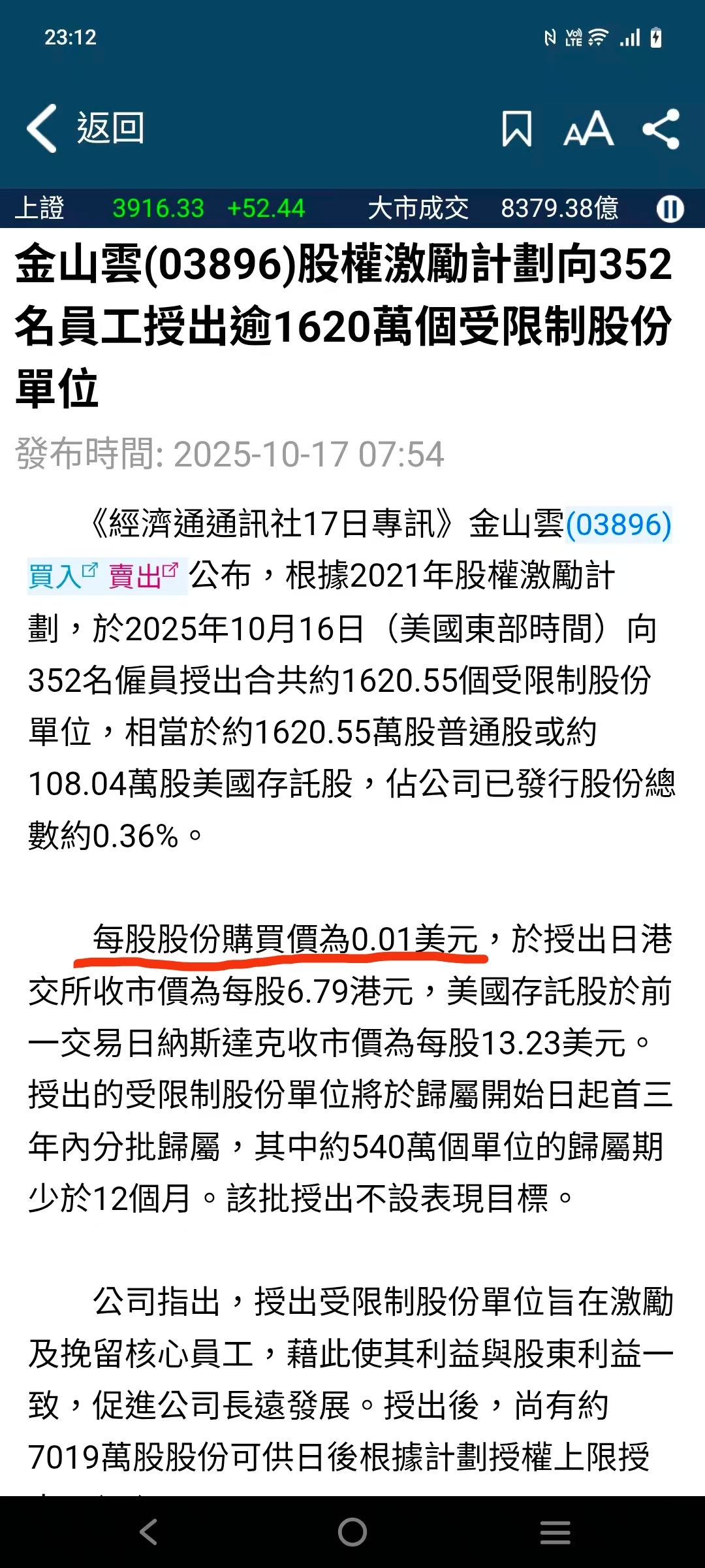 $金山云(HK|03896)$ $金山云 (03896.HK)$ 不停地配股,还免费派股票送给352个员工当奖励!这些员工可以随时随地卖股票套现,根本不用考虑成本!还指望这种股票能涨?跌的日子在后面呢!