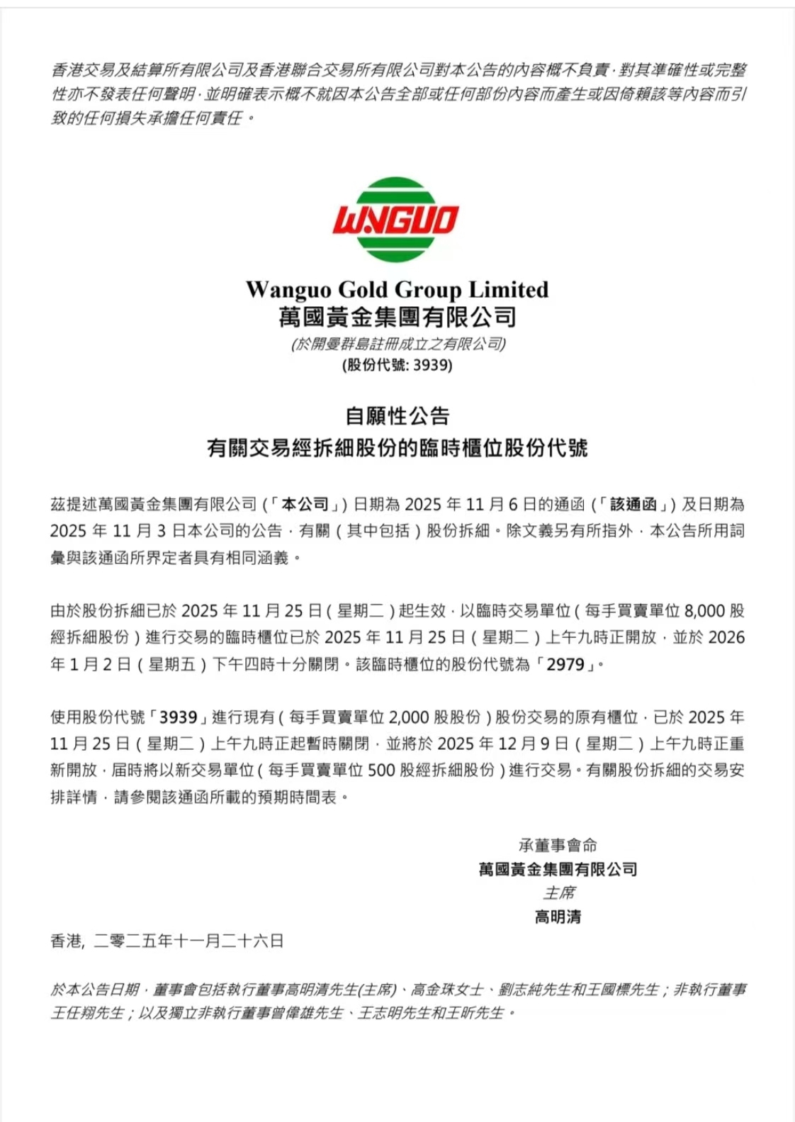$万国黄金集团(HK|03939)$ ,$万国黄金集团(HK|02979)$ 兄弟们注意啦!11月25日起实施股份拆细,旧代码3939暂时停用,现在交易用临时代码2979,每手改成8000股啦,这2979是过渡用的,大概率12月9日会换回3939,每手500股交易,具体以公司后续公告为准哦。