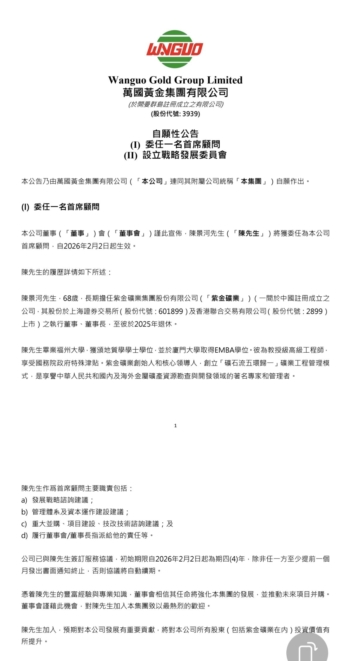 $万国黄金集团(HK|03939)$ 原来是紫金创始人陈景河以首席顾问+战发会主任加盟万国,短期提振估值与情绪,利好推动股价反弹。
