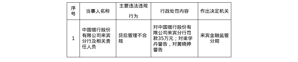 中国银行来宾分行被罚35万,涉贷后管理不合规