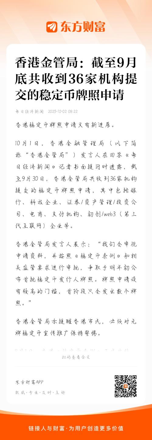 10月1日,香港金融管理局(以下简称“香港金管局”)发言人在回答《每日经济新闻》记者书面提问时透露,截至9月30日,香港金管局共收到36家机构提交的稳定币牌照申请,其中包括银行、科技企业、证券/资产管理/投资公司、电商、支付机构、初创/web3(第三代互联网)企业等。