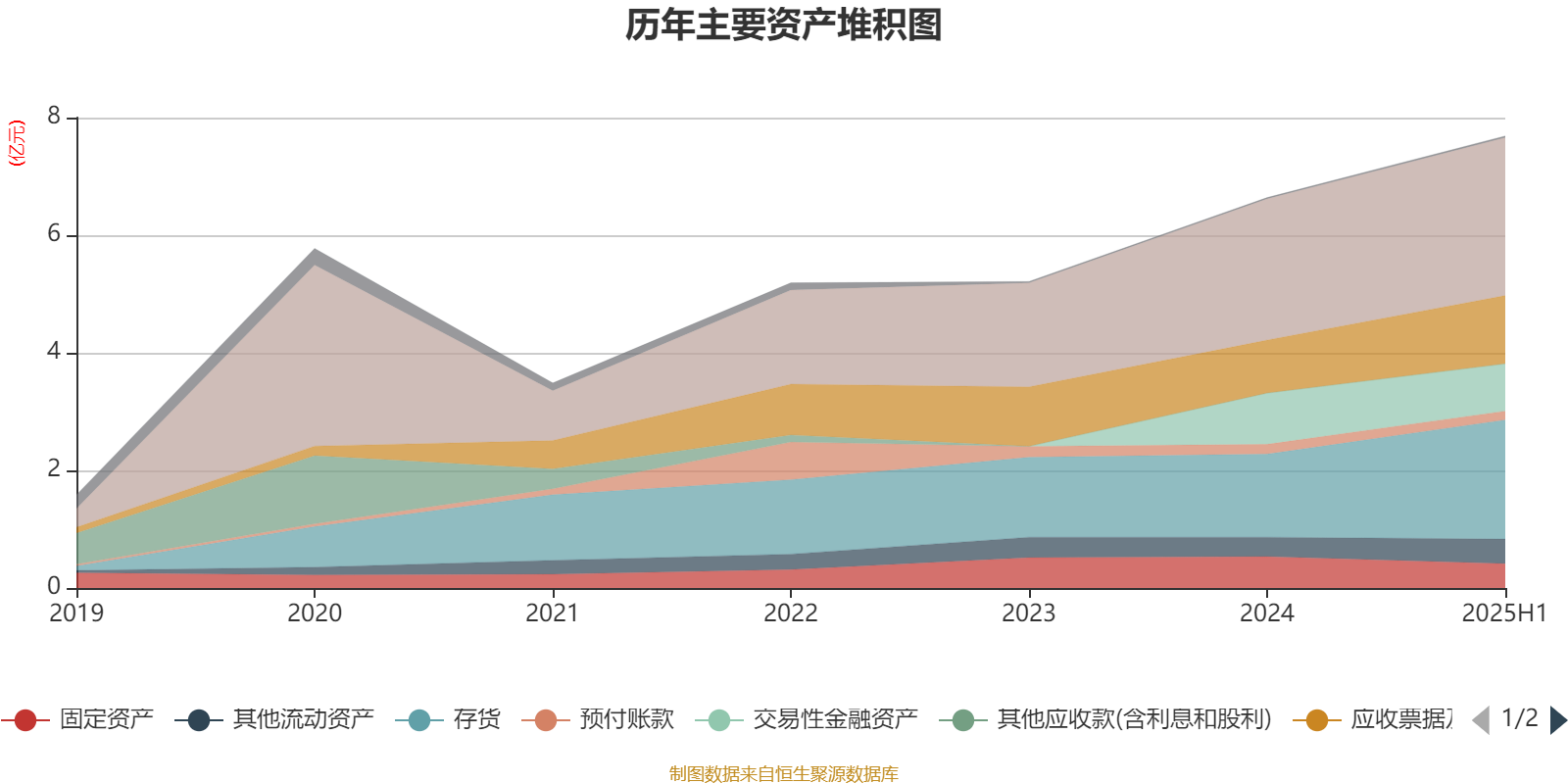 资产重大变化方面,截至2025年上半年,公司存货较上期末增加43.31%,占公司总资产比重上升5.07个百分点;固定资产较上期末减少22.64%,占公司总资产比重下降2.67个百分点;交易性金融资产较上期末减少7.71%,占公司总资产比重下降2.65个百分点;应收票据及应收账款较上期末增加28.93%,占公司总资产比重上升1.55个百分点。