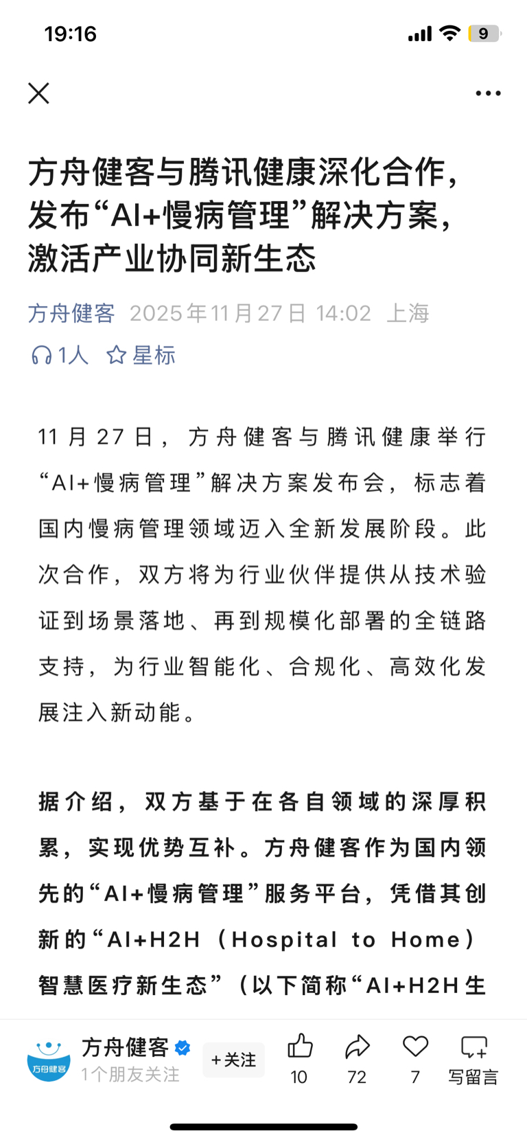方舟健客与腾讯健康深化合作,发布“AI+慢病管理”解决方案,激活产业协同新生态方
