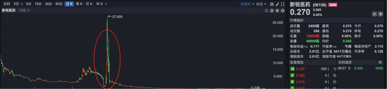 这50只股票被David Webb点名之后,多数个股很快就遭遇腰斩。随便翻看一只个股新锐医药(HK06108),2017年前后,该股股价巨幅波动,但现在只剩0.2港元。