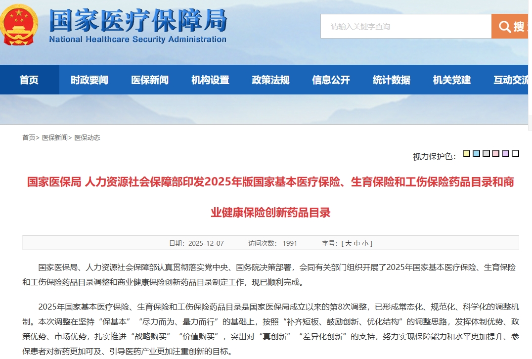 12月7日上午,2025创新药高质量发展大会在广州召开。会议发布了2025年《国家基本医疗保险、生育保险和工伤保险药品目录》以及备受瞩目的首版《商业健康保险创新药品目录》本次2025年国家医保药品目录最大亮点在于纳入了肺癌等重大疾病用药,地中海贫血症等罕见病用药;以及糖尿病等慢性病用药。