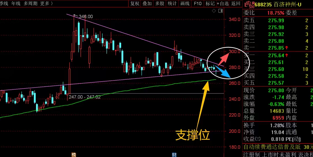 $百济神州(HK|06160)$ 前几天说过,近期主要是重点观察一个大三角收敛形态完成后的方向选择,今天来看,小幅跌破了下方趋势线,但下午拉回来了,没有形成有效跌破,那接下来就继续观察,不着急,如果跌破的话下方大均线264.65位置作为防守位应对,有效跌破无脑大幅减仓应对,不用纠结,拉回来站稳了再考虑回补仓位,不着急。#复盘记录# #炒股日记#