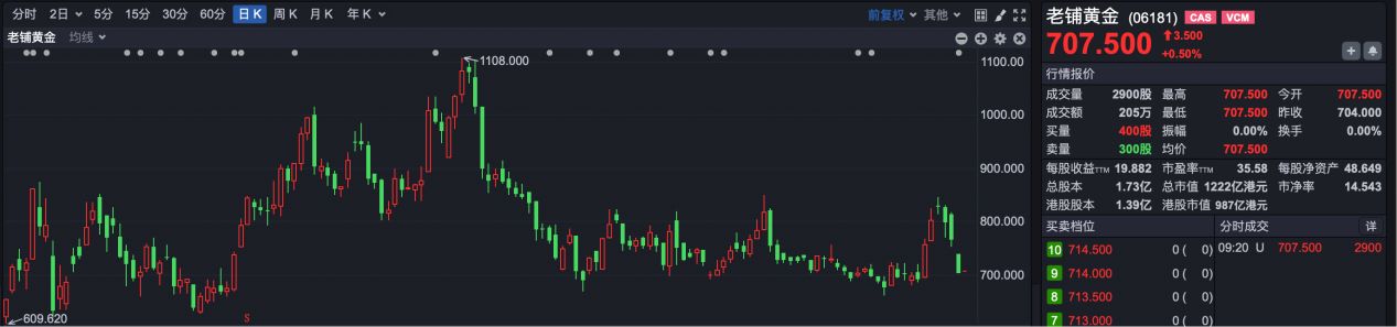 今日早间,老铺黄金高开0.5%,报707.50港元。今年7月8日,老铺黄金股价创下1108港元后开始持续调整。