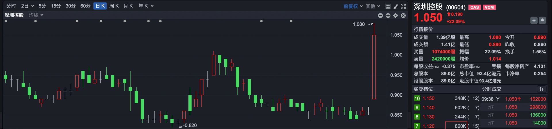 焦点板块方面,粤港澳概念股走强。其中,深圳控股(00604.HK)涨近20%、粤海置地(00124.HK)、碧桂园(02007.HK)、深圳国际(00152.HK)等涨超1%。