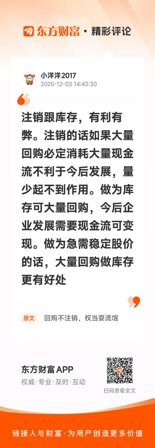 //@小洋洋2017 :注销跟库存,有利有弊。注销的话如果大量回购必定消耗大量现金流不利于今后发展,量少起不到作用。做为库存可大量回购,今后企业发展需要现金流可变现。做为急需稳定股价的话,大量回购做库存更有好处