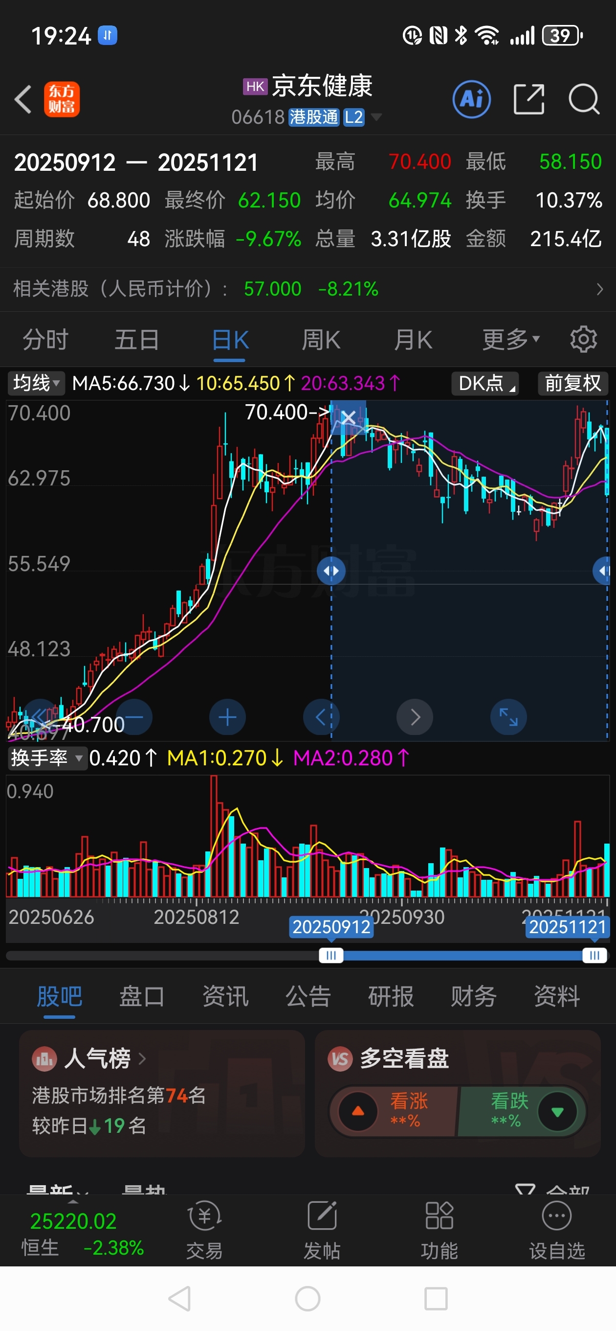 京东健康调整幅度仍不够,很多绩优股依然躲不过泥沙俱下的调整。京东健康也不例外。