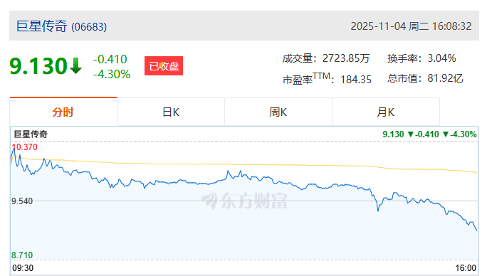 受上述消息影响,巨星传奇盘中一度拉升涨超8%,收盘转跌。截至收盘,该公司股价跌4.3%,报9.13港元/股。