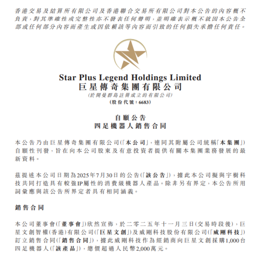 11月4日,巨星传奇发布公告称,其全资子公司巨星文创智权(香港)有限公司与威刚科技股份有限公司已签订销售合同,威刚科技将作为经销商向巨星文创采购1000台四足机器人,总价值超过人民币2000万元。