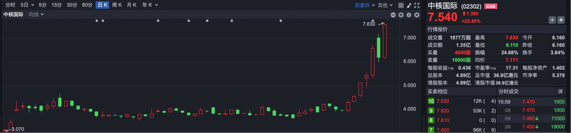 其他热点,港股核电板块走强,中核国际(02302.HK)大涨22%,中广核矿业(01164.HK)涨超7%,上海电气(02727.HK)、哈尔滨电气(01133.HK)、东方电气(01072.HK)等跟涨。