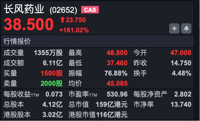 新股方面,长风药业(02652.HK)上市首日大涨。截至收盘,长风药业上涨161%,涨幅较上午有所收窄。公开发售阶段,长风药业获约6697.8倍超额认购,共接获近26.42万份有效申请。由于认购倍数极高,公开发售股份最终数目增至412万股,占全球发售股份总数的约10%。申购一手的投资者获配发股份的几率极低,中签率仅为1%。国际配售部分同样获得超额认购,倍数约为12.74倍。