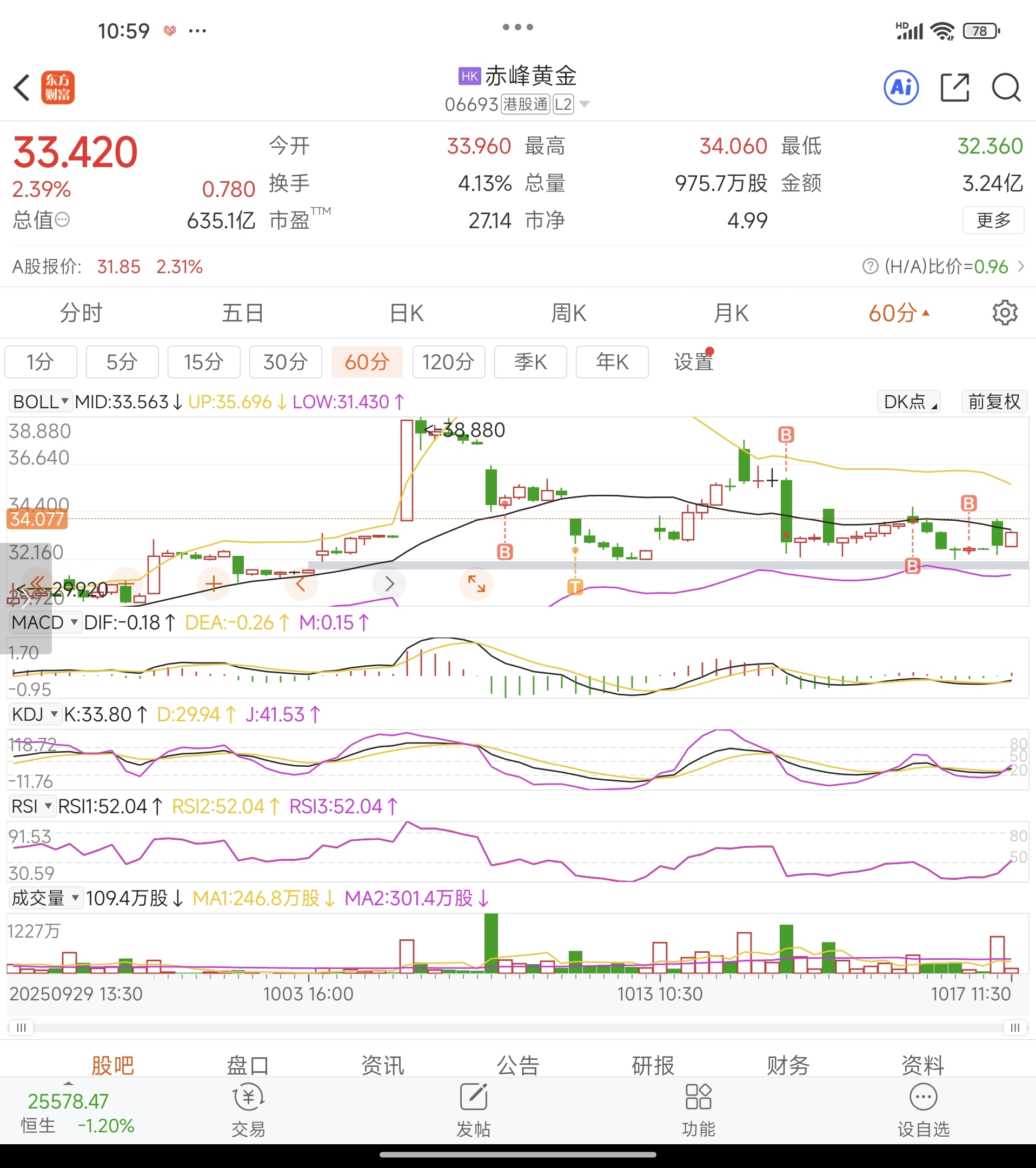 $赤峰黄金(HK|06693)$ 看60分钟线,一直在这里跌不下去!能告诉我你们的看法吗