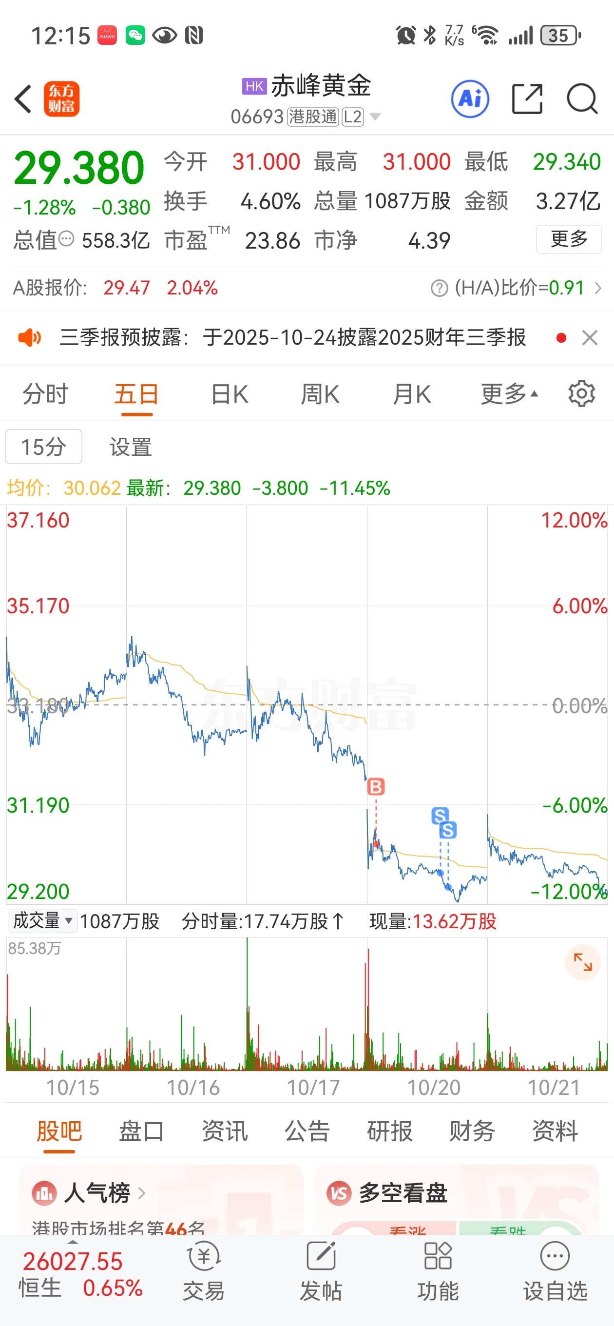$赤峰黄金(HK|06693)$ @妙想 前天重仓亏两个点没有白亏,不然昨天尾盘很可能就全仓买进啦!塞翁失马,焉知非福!