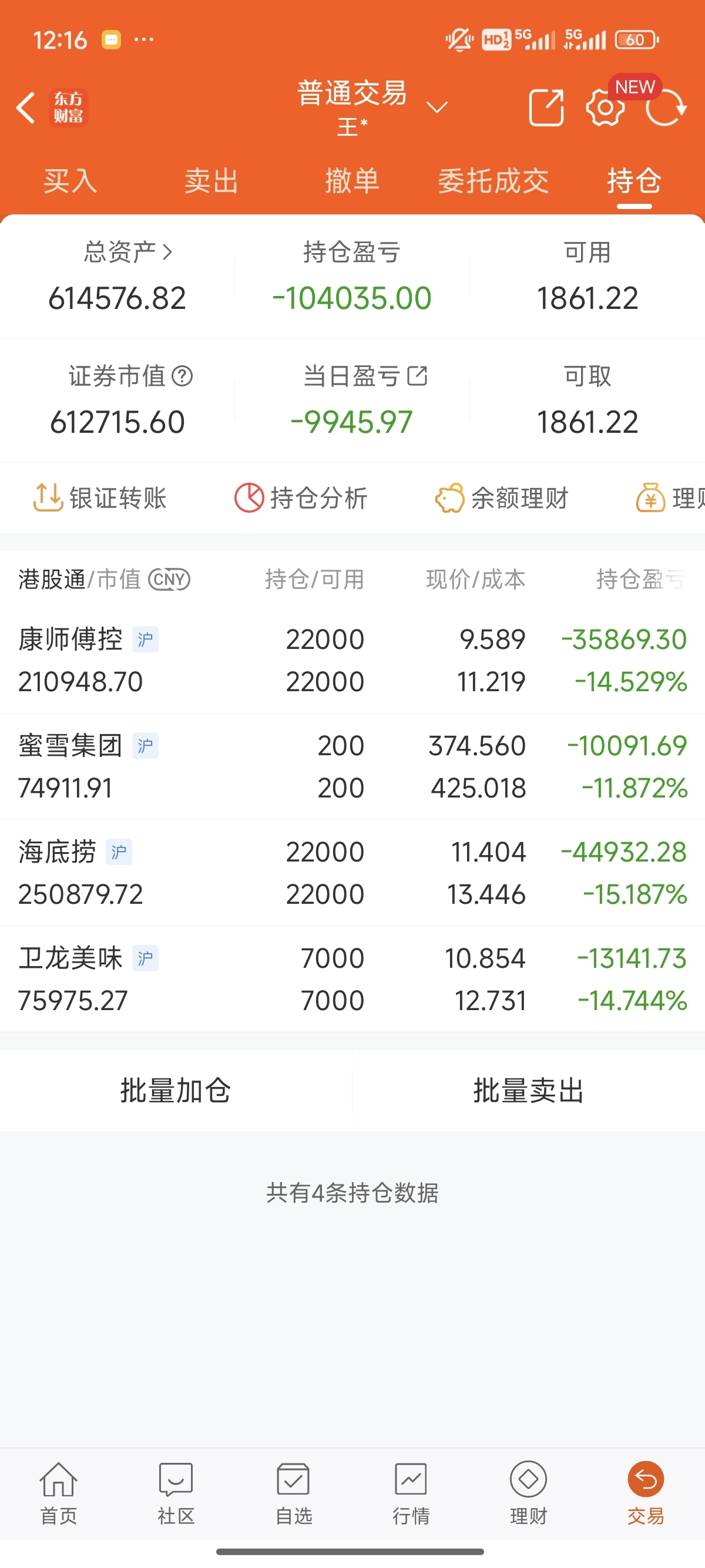 $海底捞(HK|06862)$ 谁有我惨,全仓港股食品股,亏麻了,涨的时候不跟科技涨,跌的时候跌的挺快的