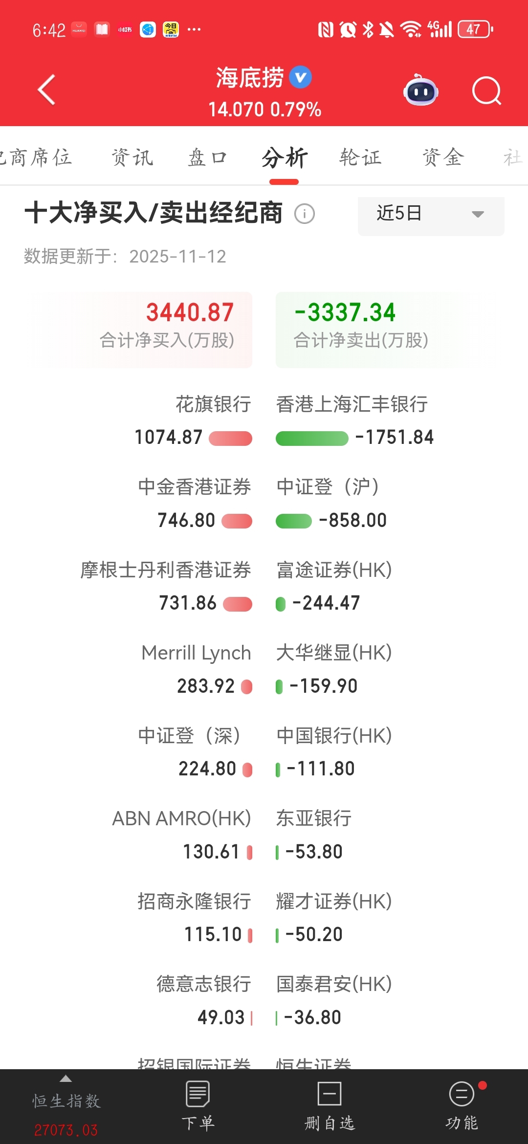 $海底捞(HK|06862)$ 近5天上涨是这几家投行买进的?尤其是中金香港!