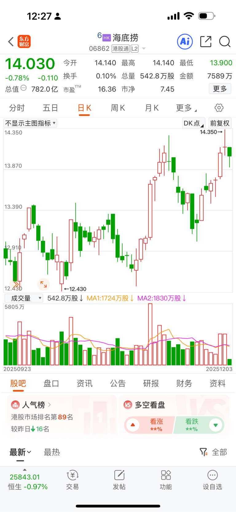 $海底捞(HK|06862)$ M头双顶已经形成,最少要调整10天左右,底仓不动,剩下的去打野!15号左右再回来!