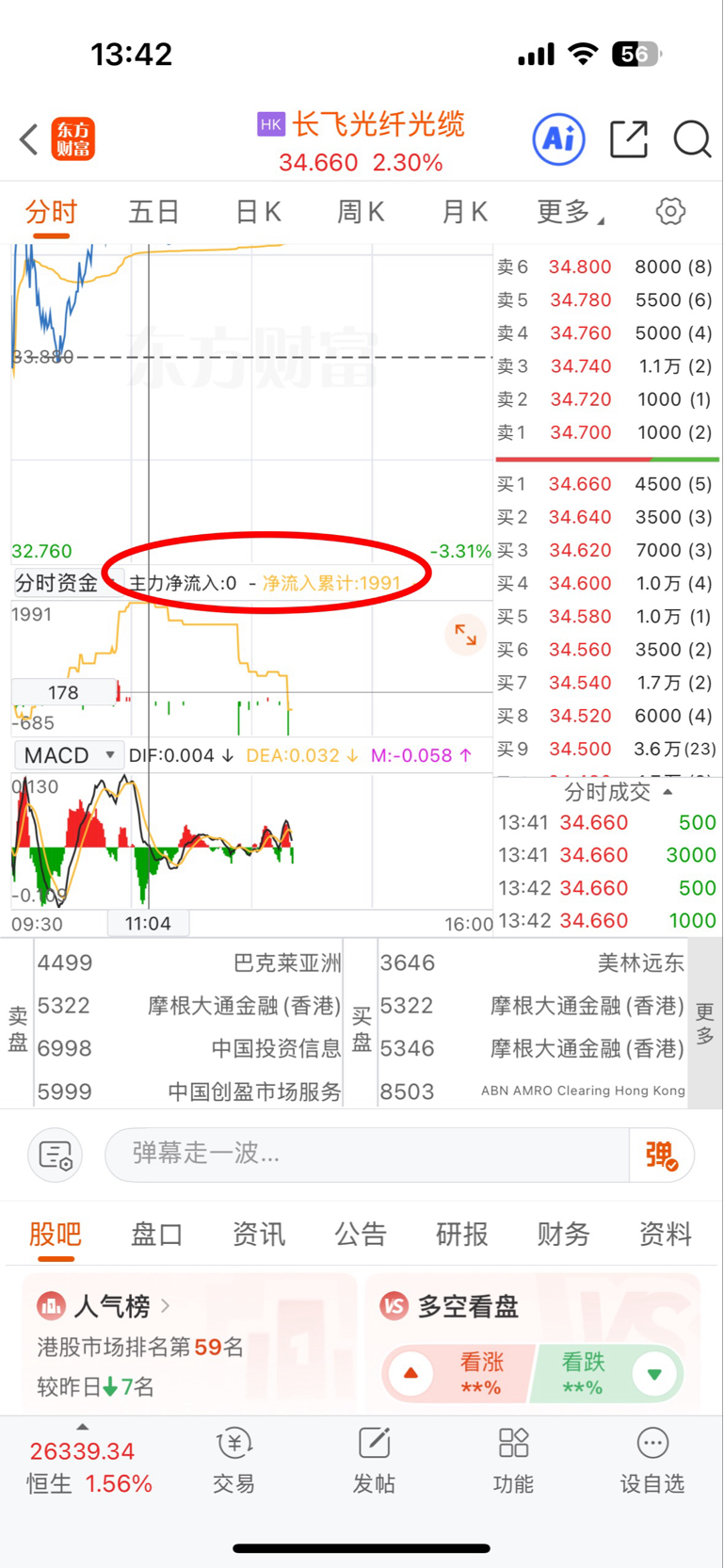 $长飞光纤光缆(HK|06869)$ 狗都不跟他玩,要么就是流出,要么就是先流入,下午全部卖掉,又砸又T的狗股