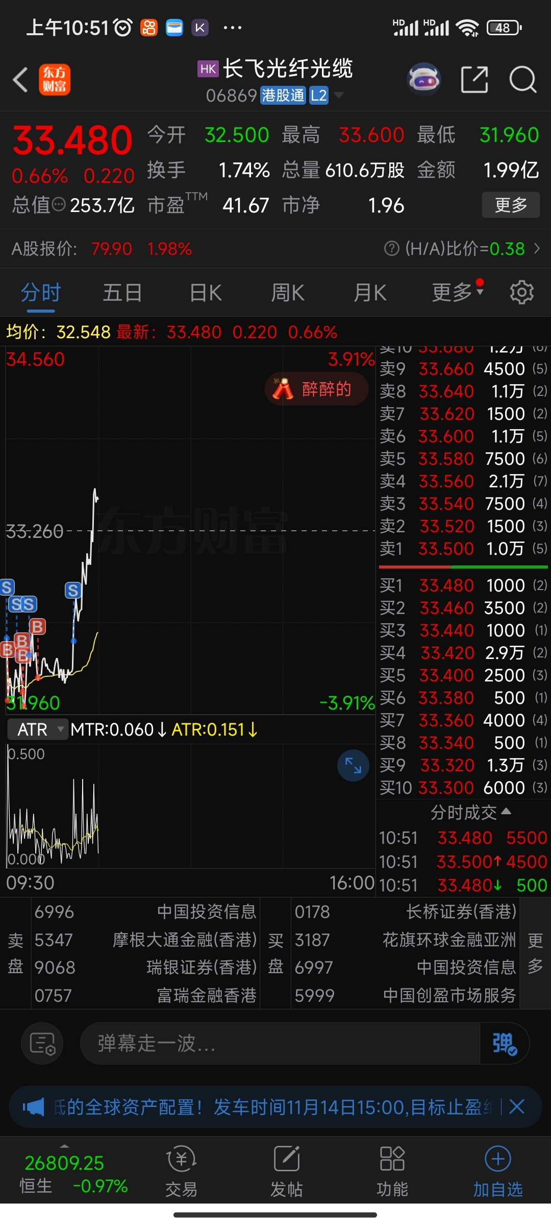 $长飞光纤光缆(HK|06869)$ 一顿操作猛如虎 结果卖飞了