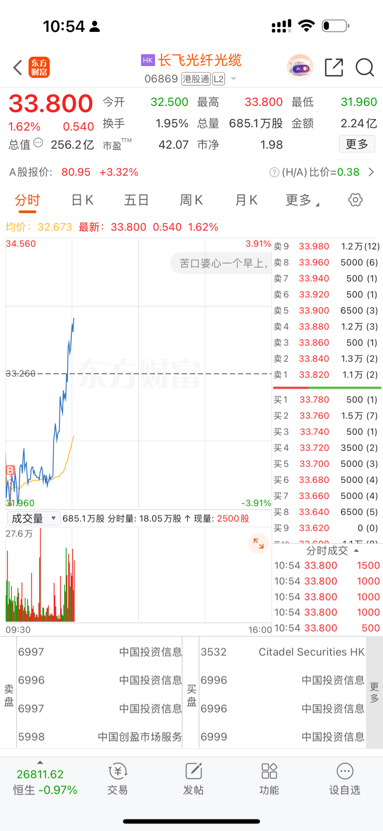 $长飞光纤光缆(HK|06869)$ 每天做T回本,今天终于赶上了