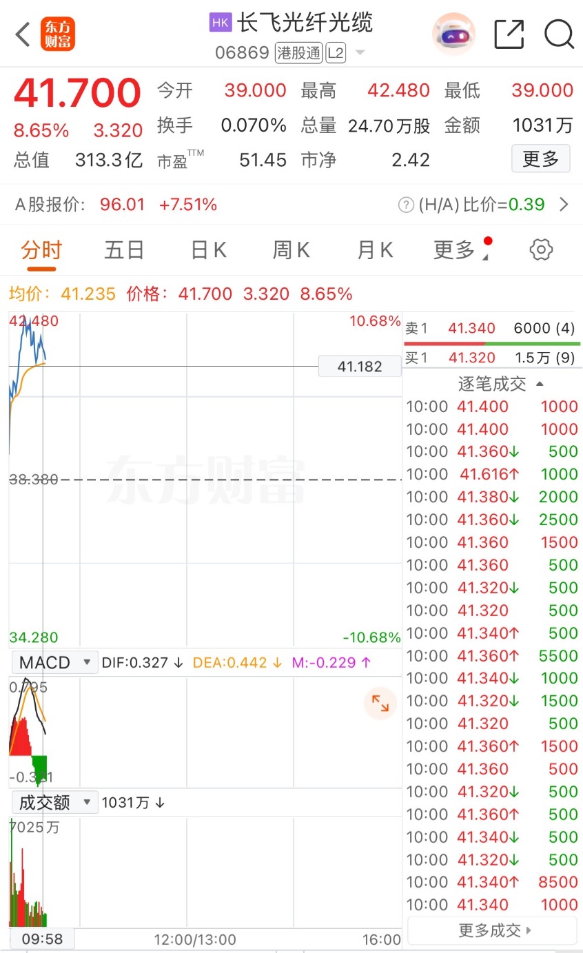 12月17日,长飞光纤光缆早盘一度涨超10%,最高报42.48港元/股。截至9时58分,长飞光纤光缆涨8.65%,报41.7港元/股,总市值约313.3亿港元。