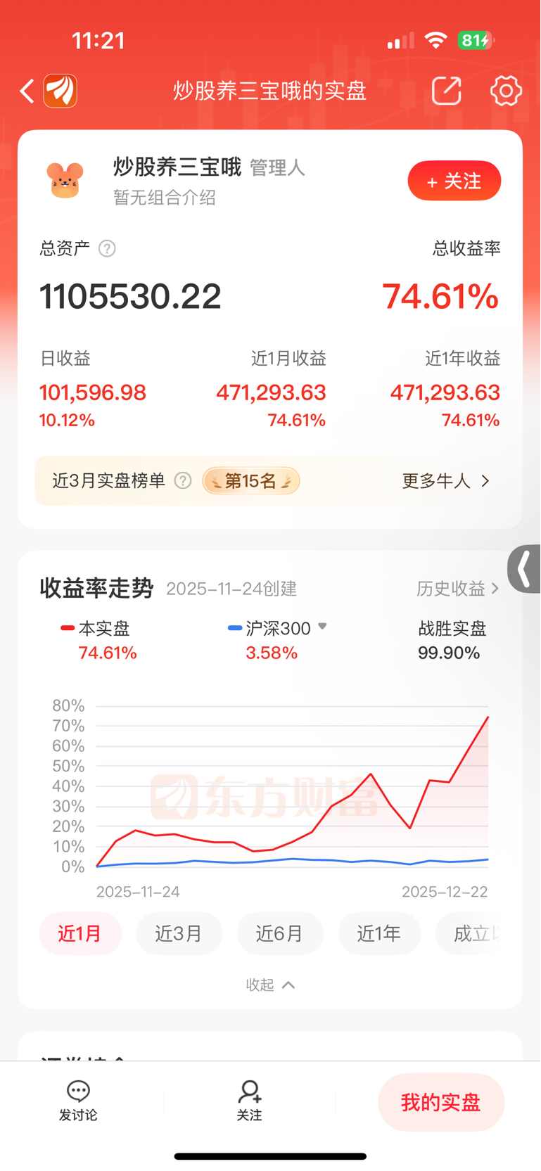 $长飞光纤光缆(HK|06869)$ 这个最坏的B天天忽悠你们,赚你们钱!你们看他的收益曲线个长飞同频吗?他做T空仓,然后每天叫多!我在提示那个时候风险,他天天怼我!赚了75个点!他要真的天天多,能赚这么多个点?他总资金才多少?你们好好算下!赚得谁得钱?你们一群小可爱,还给他舔。真是活该!