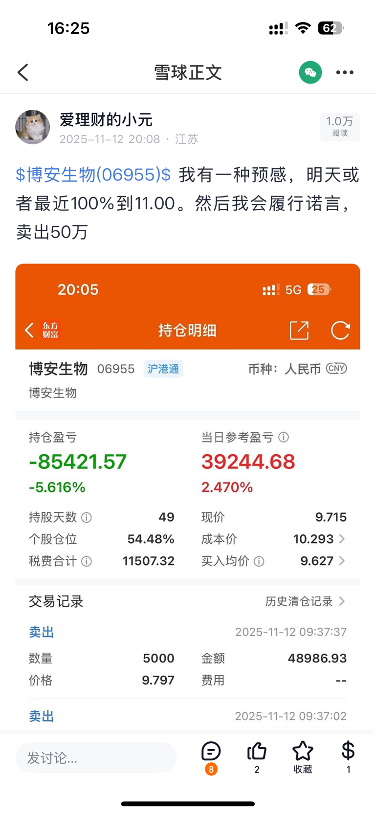 $博安生物(HK|06955)$ 说到做到,到11了,卖出50万。剩100万,还有三个点彻底回本。祝大家早日回本早日盈利。