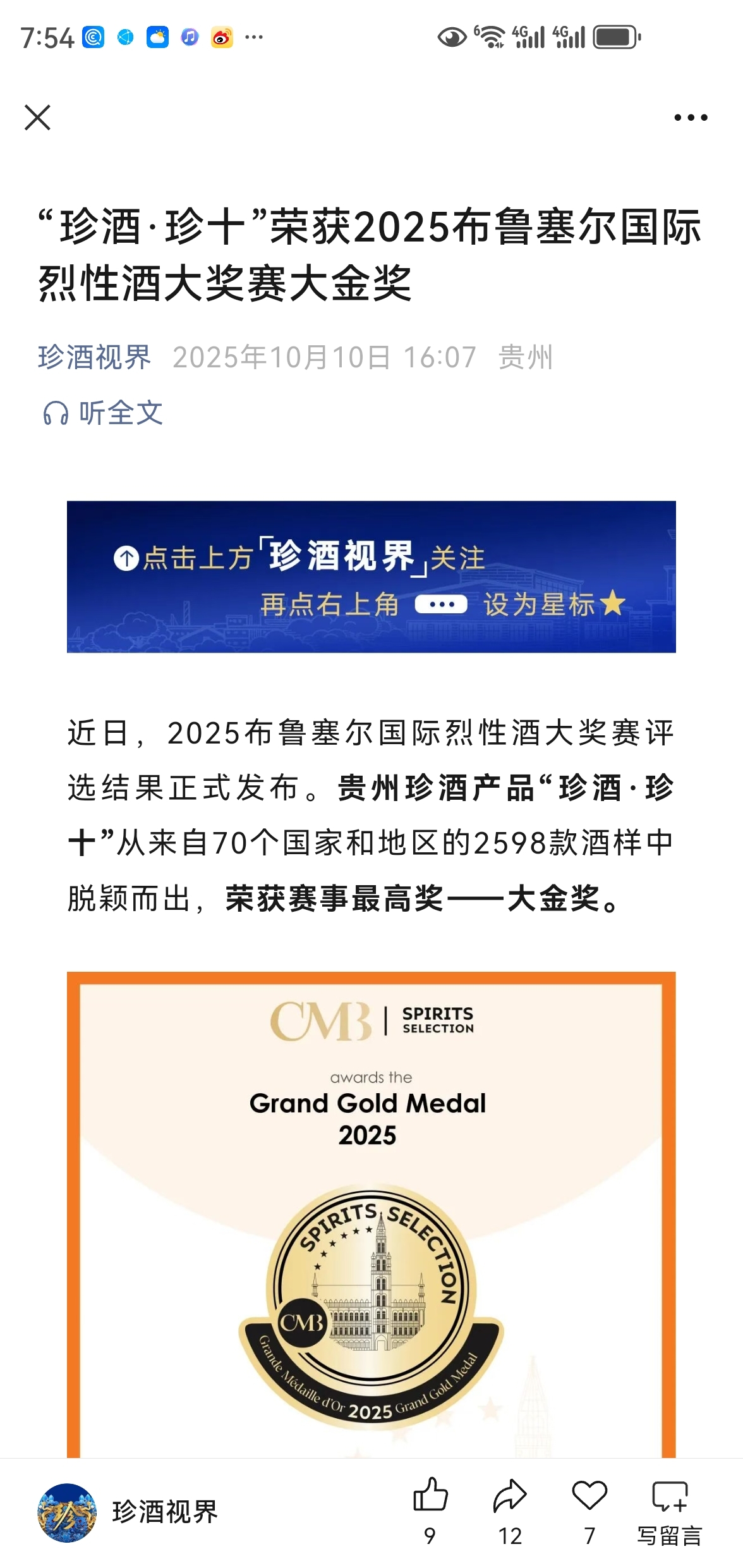 重磅利好!“珍酒·珍十”荣获2025布鲁塞尔国际烈性酒大奖赛大金奖!创立于199