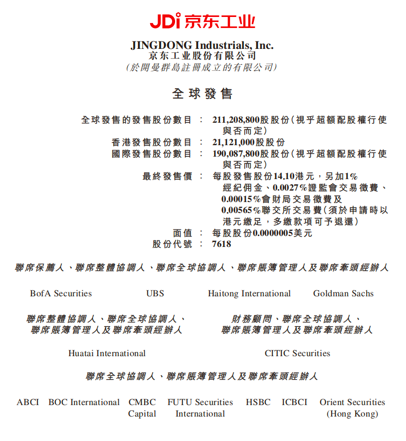 “京东系”版图再度扩张!京东工业12月11日正式于港交所主板上市,股票代码为7618。据港交所12月10日晚公告,京东工业公开发售价定为每股14.1港元,若不行使超额配股权,全球发售募集资金净额约28.27亿港元。