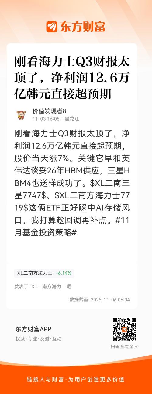 刚看海力士Q3财报太顶了,净利润12.6万亿韩元直接超预期,股价当天涨7%。关键它早和英伟达谈妥26年HBM供应,三星HBM4也送样成功了。$XL二南三星7747$、$XL二南方海力士7719$这俩ETF正好踩中AI存储风口,我打算趁回调再补点。#11月基金投资策略#