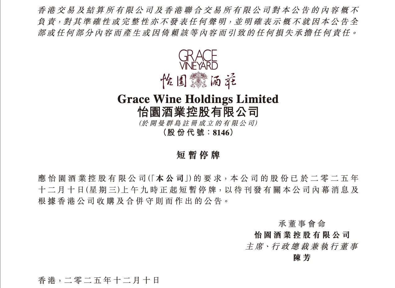 此前,怡园酒业公告自12月10日起短暂停牌。