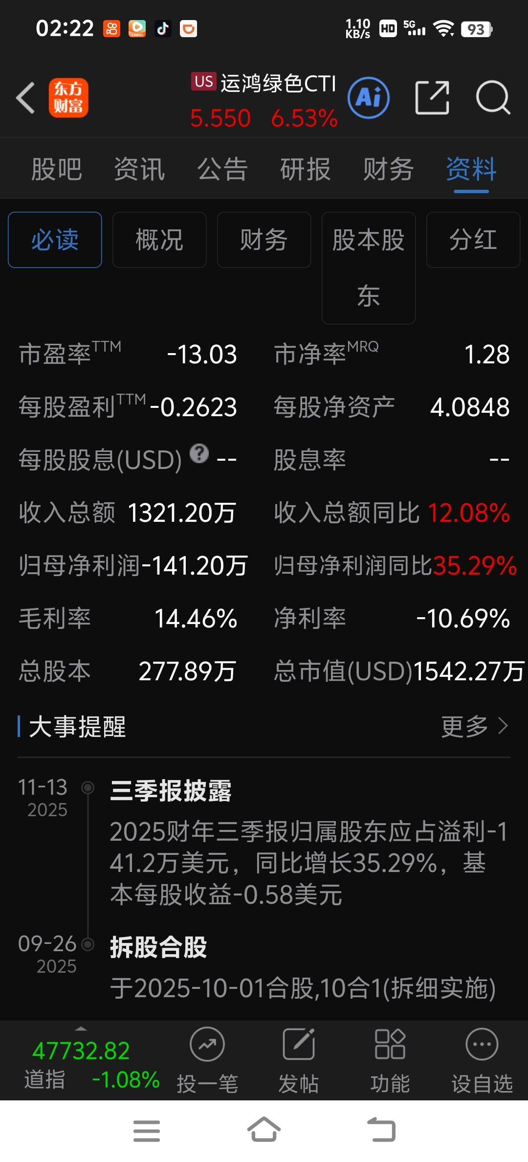 《运鸿三季度财务》955的家人们,告诉你们一个好消息,啊吹的运鸿第三季度财务出来咯,亏损141万美元折合亏损1000万人民币,每股收益亏0.58元,折合亏4元多人民币,总市值约一个亿,和啊吹吹的万亿市值差了一万倍