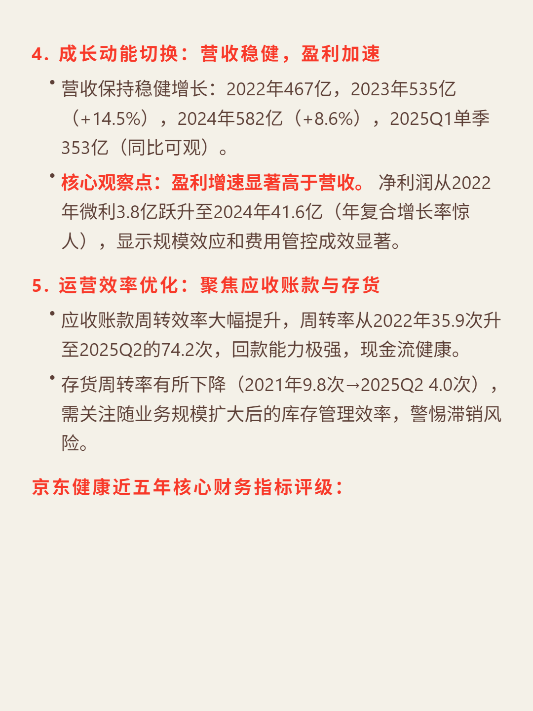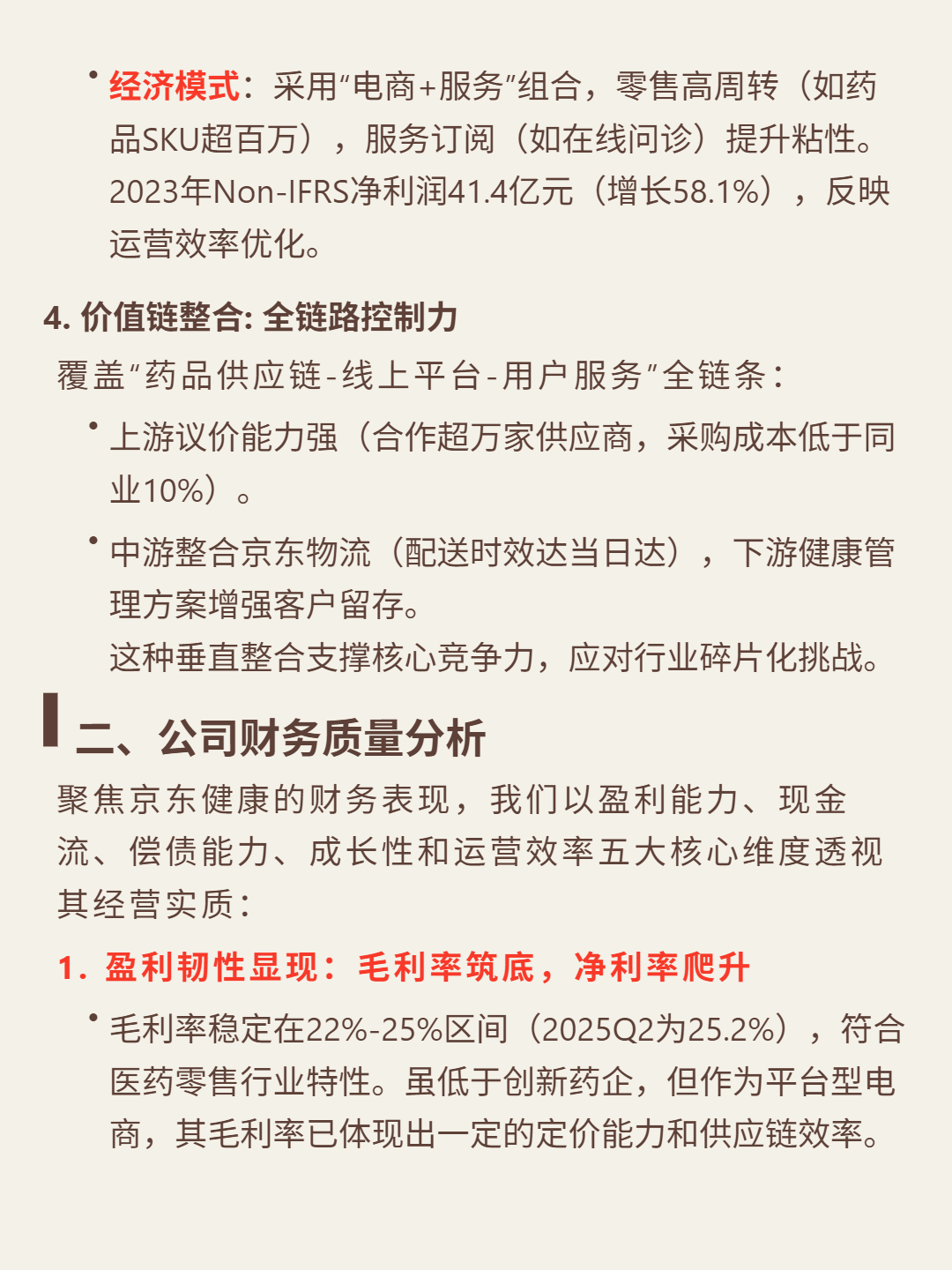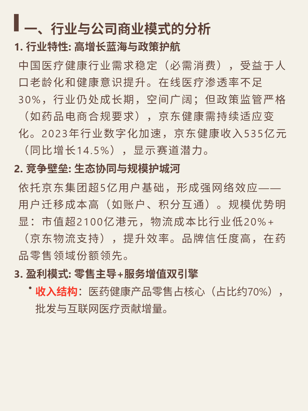 核心逻辑:医疗健康为必需消费,在线渗透率不足30%,行业处成长期但政策监管严;依托京东5亿用户与物流,生态协同形成高迁移成本,规模优势使物流成本比行业低20%+;盈利以医药零售(占70%)为主,叠加在线问诊等服务增值。