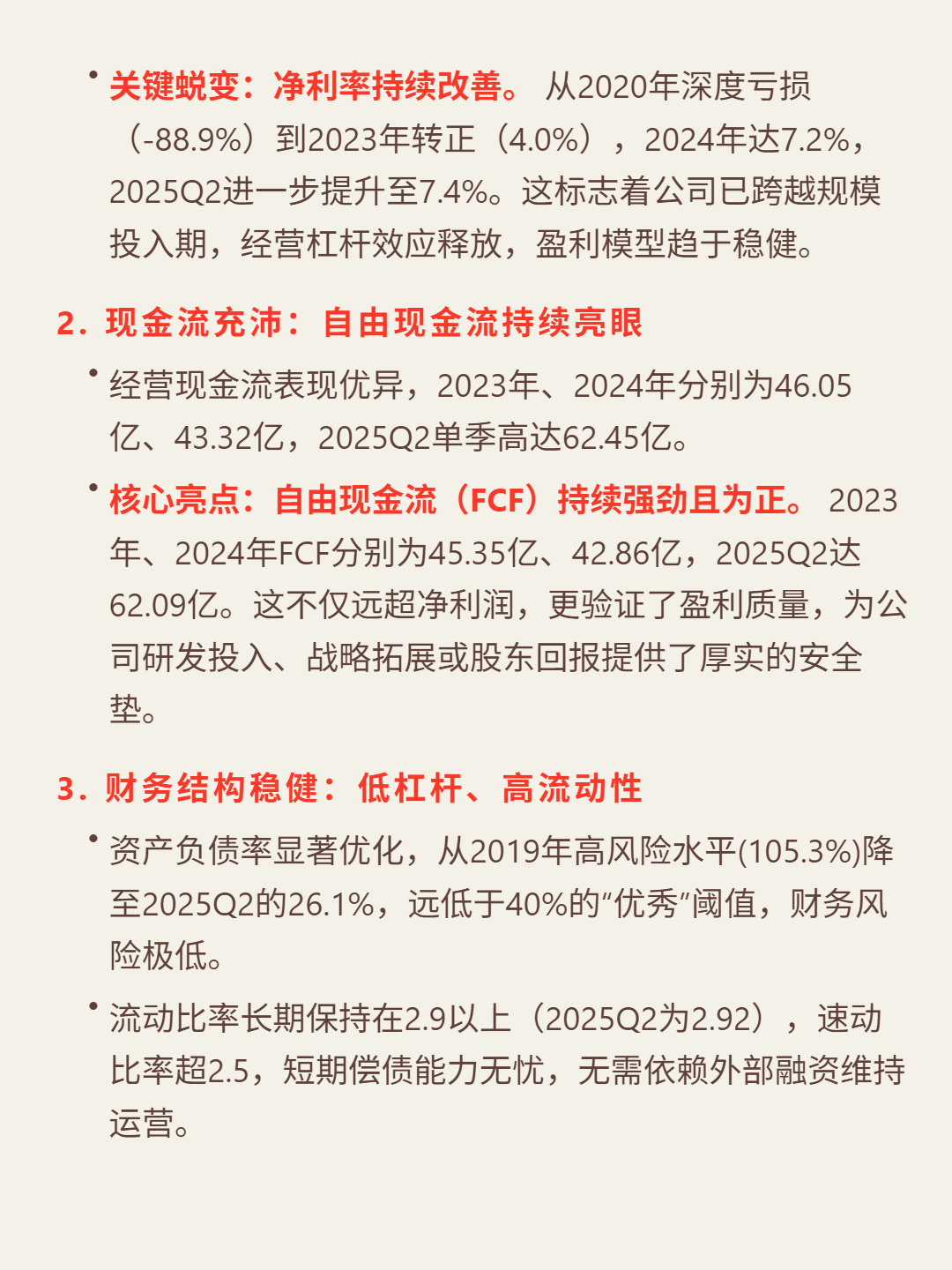 财务亮点:净利率从2020年-88.9%持续改善,2025Q2达7.4%;自由现金流强劲,2025Q2单季62.09亿,远超净利润,验证盈利质量;资产负债率26.1%(2025Q2),流动比率2.92,财务风险极低;盈利增速显著高于营收,2024年净利润41.6亿(年复合增长率惊人);需关注存货周转率下降(2025Q2 4.0次)。