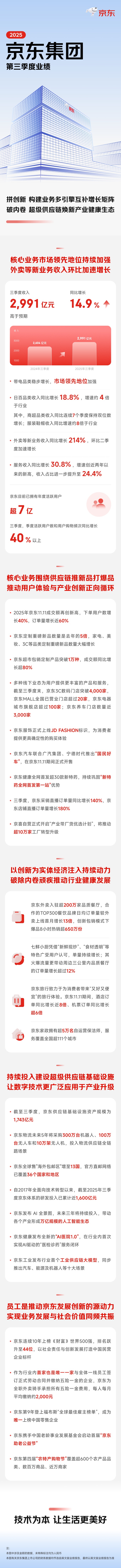 11月13日,京东集团发布了2025年第三季度业绩。第三季度,京东集团收入为2991亿元,同比增长14.9%,超出预期。