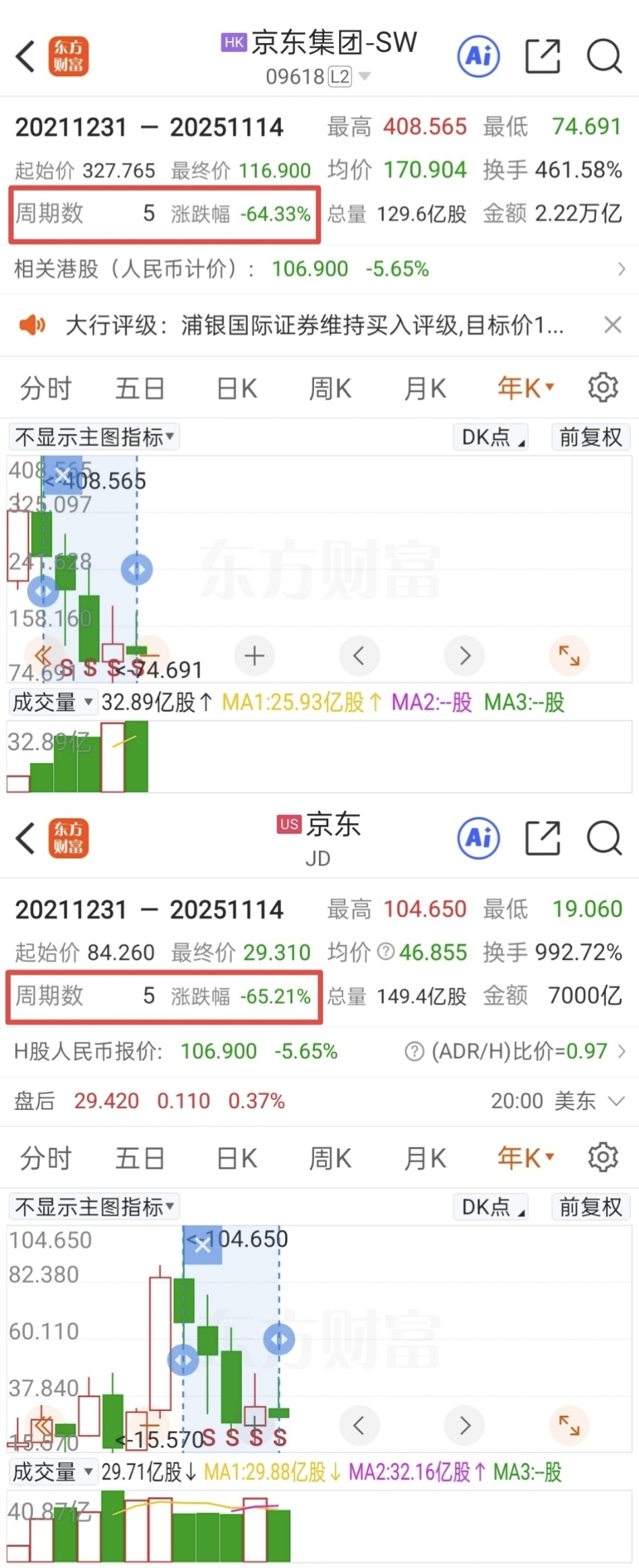 京东集团港股和美股你追我赶,生怕跌慢了,港股五年下跌64.33%,美股晚上就一定