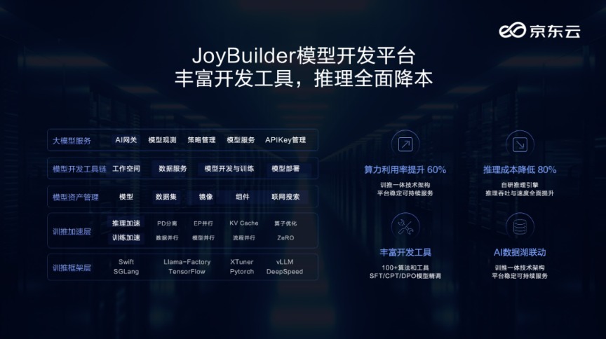 在模型训推方面,京东云JoyBuilder打造了三大核心优势:首先,得益于自研的高性能推理引擎,模型训练与推理效率提升400%;其次,平台集成50种开源模型和数据集,提供100余种算法工具链,让企业能基于自身数据快速构建专属大模型;最终,通过高可用云原生系统实现的秒级扩缩容能力,在保障服务稳定性的同时,总体应用成本降低80%。