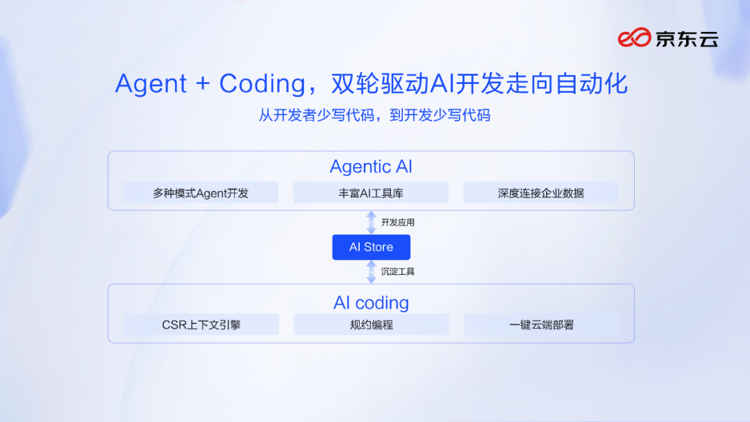 京东集团技术委员会主席、京东云事业部总裁曹鹏表示,“Agent+Coding的AI开发新范式,正在成为AI应用开发的主流,这种以Agent简化代码、代码反哺Agent的闭环,将让AI开发越来越自动化、智能化,最终实现‘从开发者少写代码,到开发少写代码’。同时,大规模应用爆发,也将推动AI基础设施迈向标准化,AI Infra 1.0已开启。”