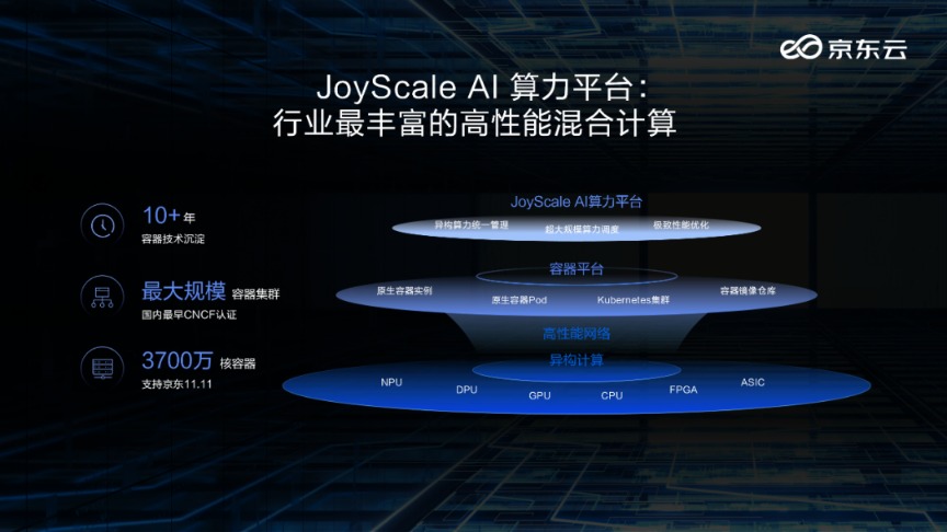 在混合计算方面,京东较早大规模部署混合算力,拥有超3700万核容器集群,历经“6·18”“双11”等极限场景检验,建立起行业最领先的混合算力技术储备,这些优势在京东云JoyScale AI算力平台中充分体现,平台跟华为昇腾、海光、寒武纪等深度合作,为企业提供高效自主的算力管理。
