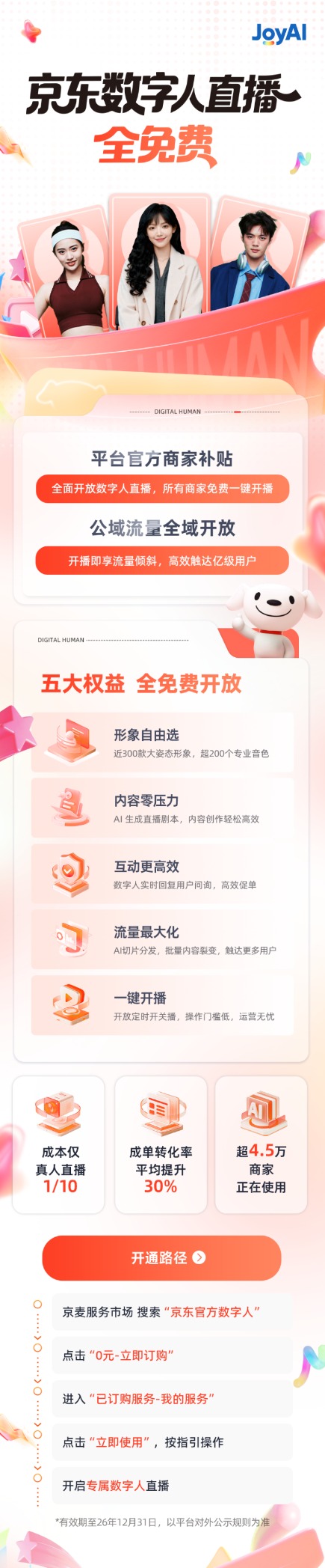 为帮助商家更好的运营,京东公域流量也向数字人直播间开放,简单来说,商家开播,平台就给流量。这意味着,商家不仅实现零成本运营,更能享受巨大的流量红利。