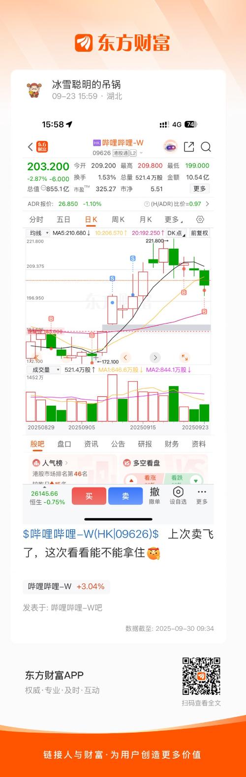 $哔哩哔哩-W(HK|09626)$  上次卖飞了,这次看看能不能拿住