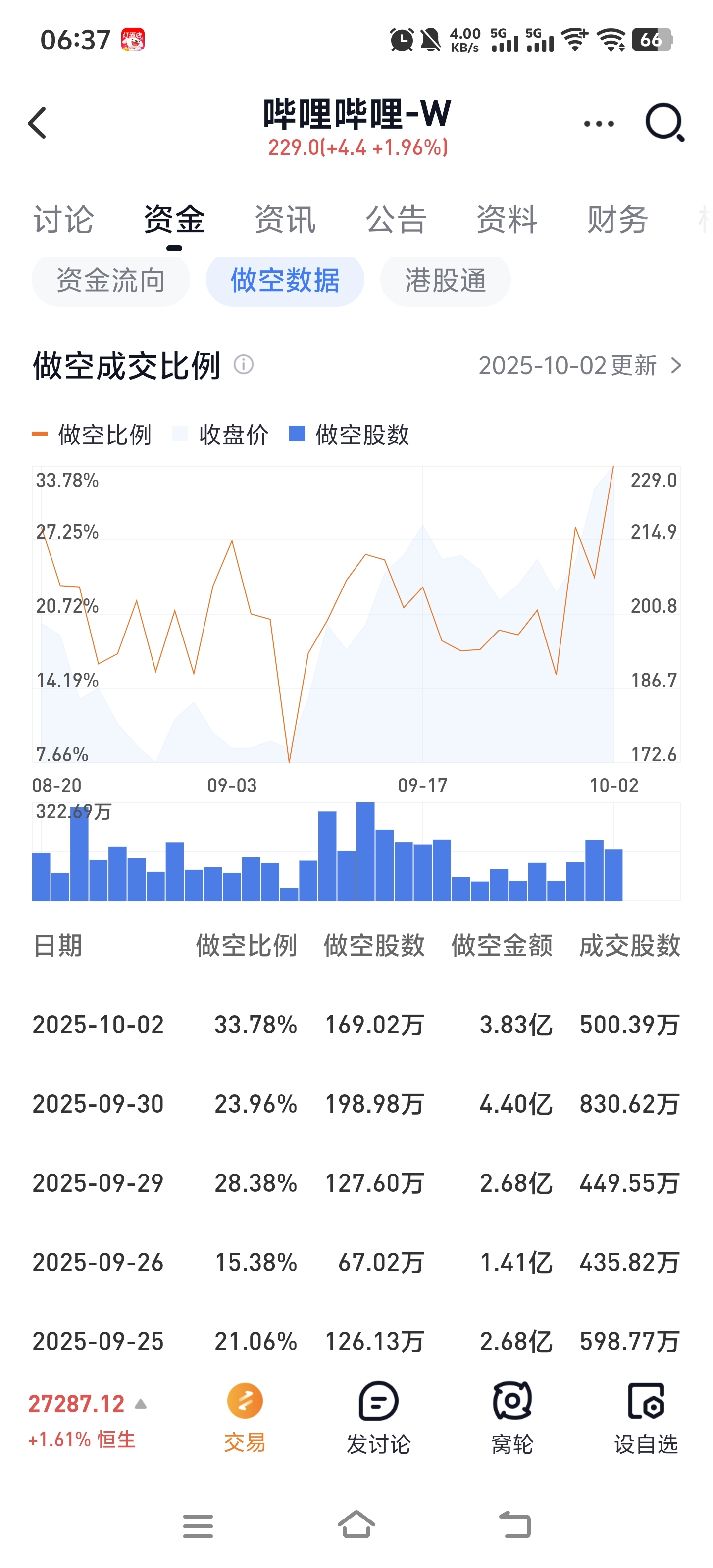 $哔哩哔哩-W(HK|09626)$ 空单好多啊