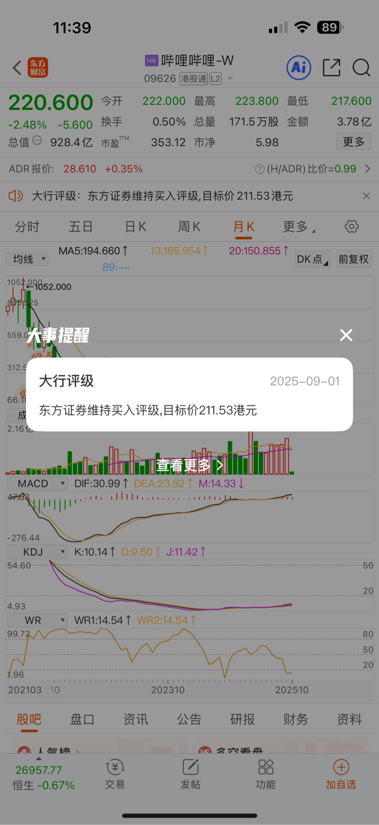 $哔哩哔哩-W(HK|09626)$ 东方证券9月1日评价,目前已经突破211了