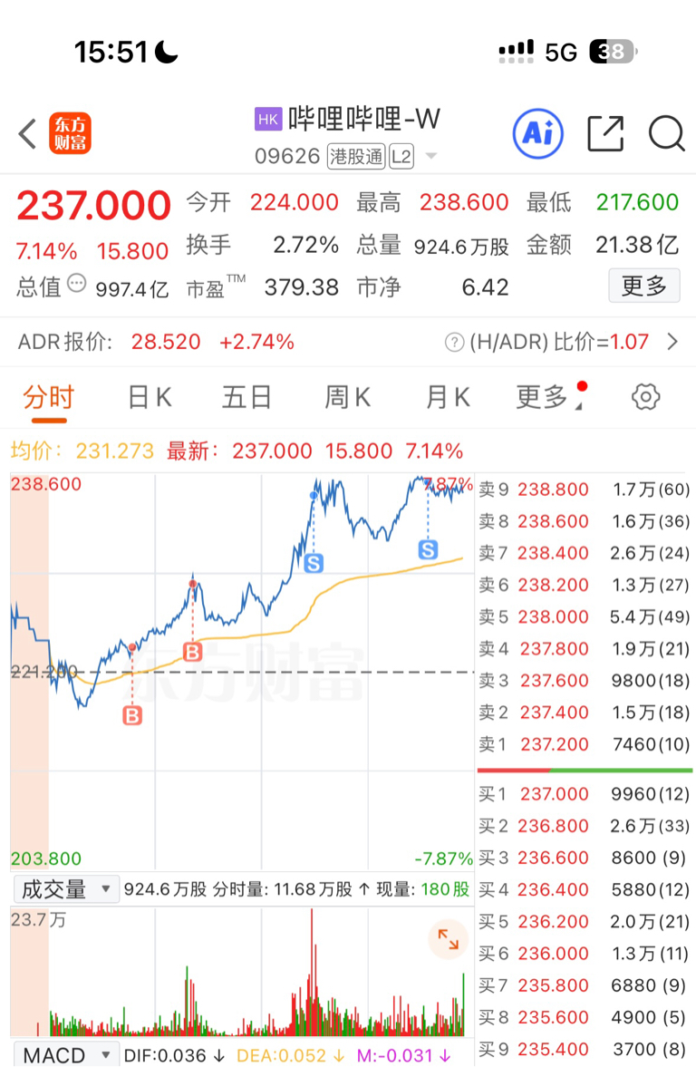 $哔哩哔哩-W(HK|09626)$ 买少了 明天给机会再来~