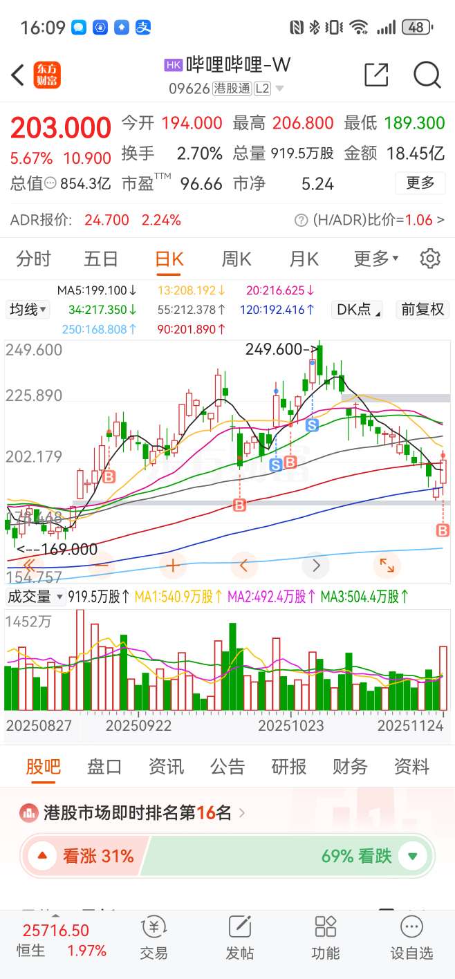 $哔哩哔哩-W(HK|09626)$ 虽然没抄到底,果断追涨,别人恐惧我贪婪。